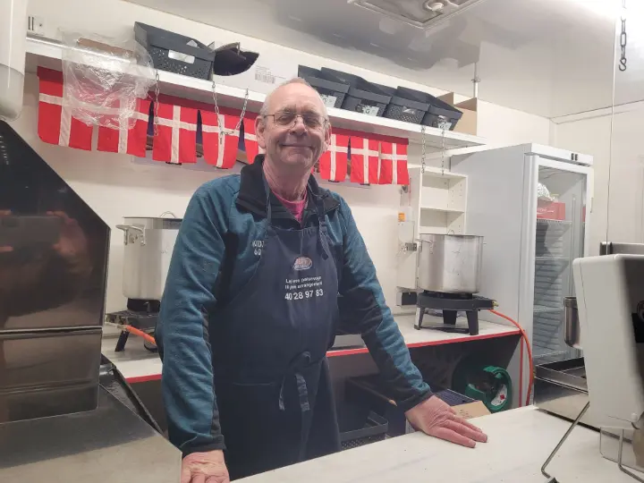 Og midt i det hele nåede han både at hilse på kunder, betjene pølsevognen, sætte juleslik på plads – og forsøge at se godt ud.