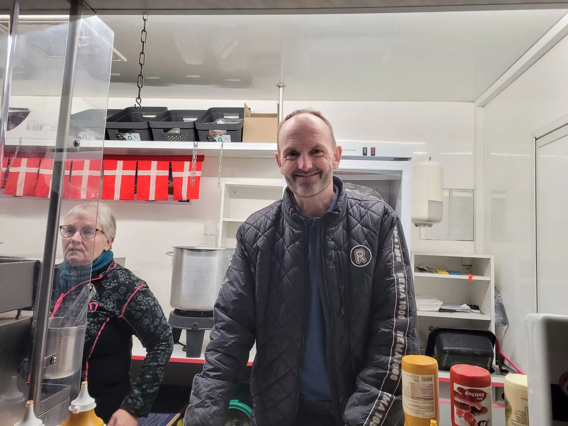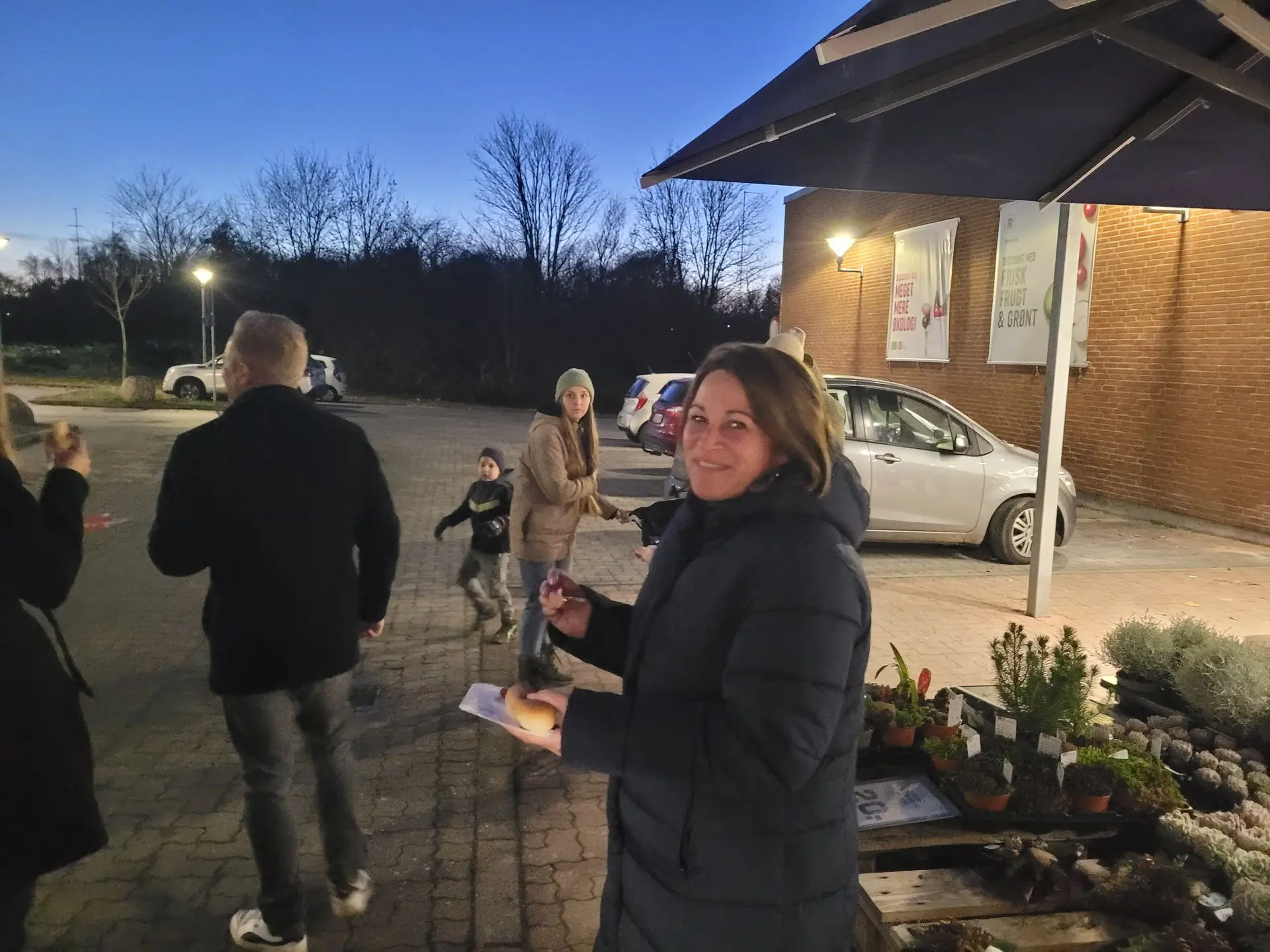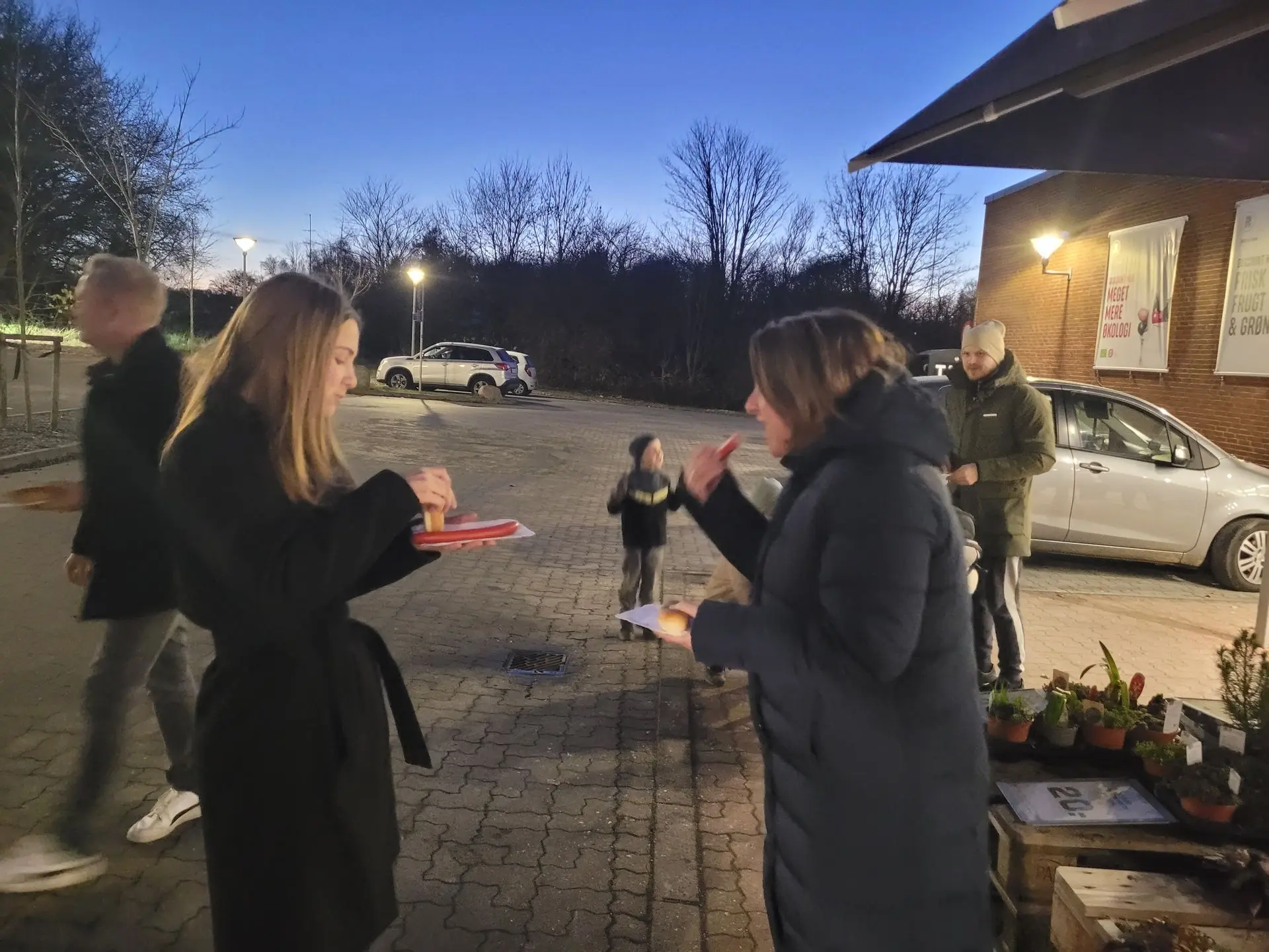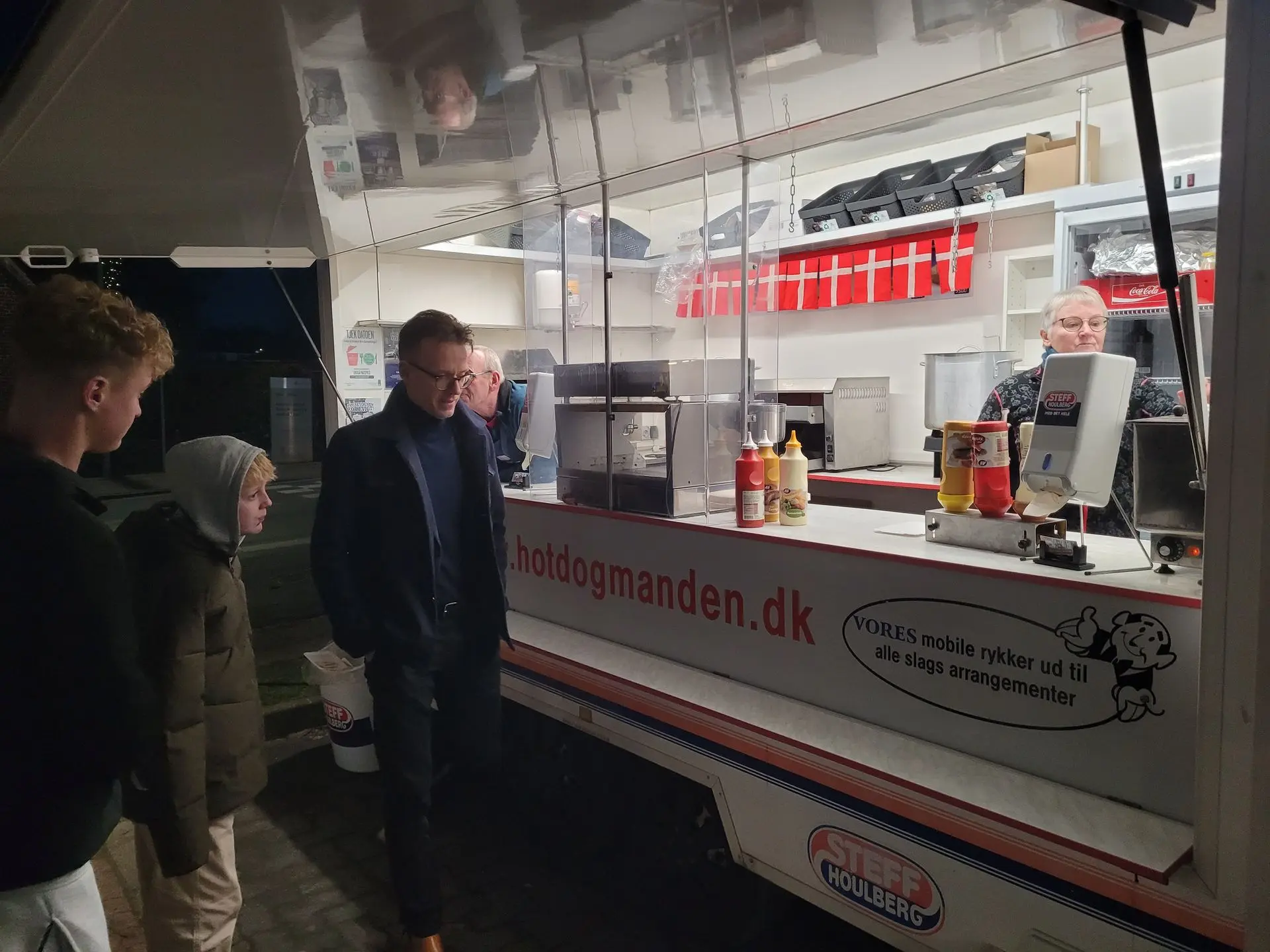 Dagen blev fejret med røde pølser, da www.hotdogmanden.dk fra Tiset slog vognen op på parkeringspladsen. Over 600 pølser blev langet over disken, og stemningen var både munter og varm – trods vinterkulden.