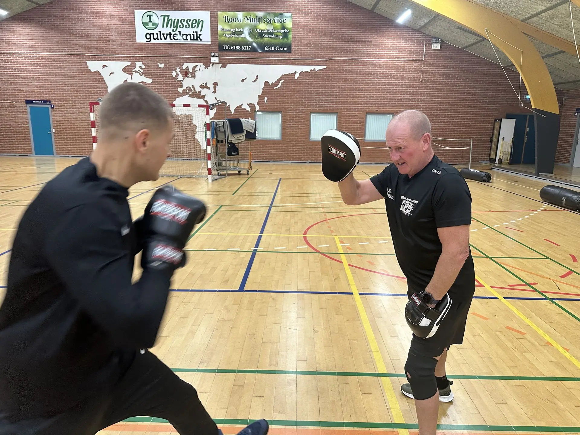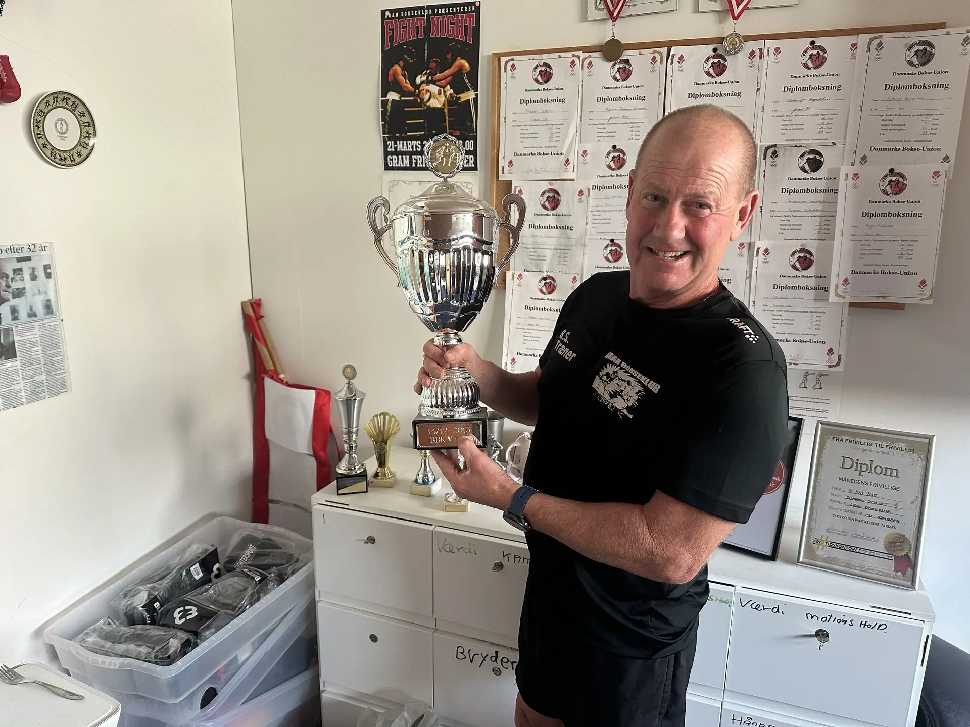 Jeg er omkring 40 år, da en af mine nevøer vil til at gå til boksning i Gram. Jeg tog med ham ned i gymnastiksalen for at træne, og så spurgte Werner, om jeg ikke ville hjælpe ham med at træne. Det er 24 år siden, og jeg har været her uafbrudt siden, fortæller Bjarne, der de seneste mange år har arbejdet som skraldemand.