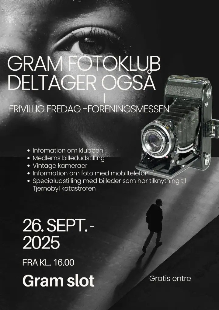 Til Frivillig Fredag vil der – udover særudstillingen – være en udstilling af billeder fra Gram Fotoklub, en udstilling af gamle fotografiapparater samt mulighed for en snak med klubbens medlemmer.