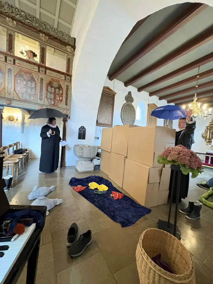 Det handlede om Noas ark. Præst Annesofie havde tømt huset for tøjdyr. Men først skulle der bygges en ark.