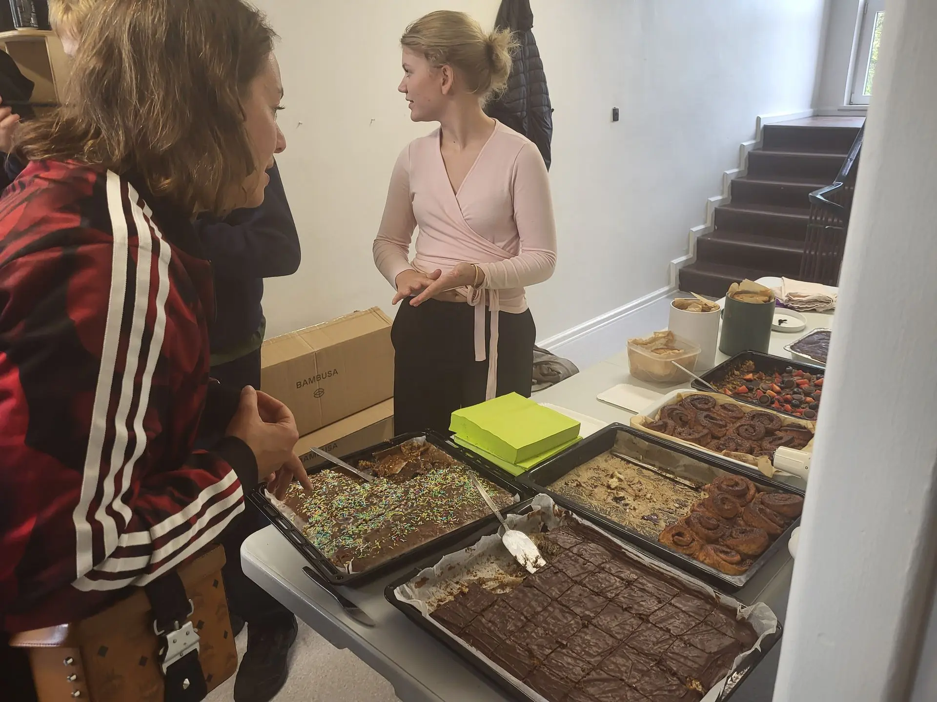 Der var dækket op i multisalen, som ellers danner rammen for morgensang på skolen. Denne dag sad gæsterne ved lange borde, og der blev serveret gratis fadøl, vin, sodavand og slushice. Var man mere til kaffe og kage, kunne dette købes sammen med et par bløde bambusstrømper i de store elevers kagebod, hvor overskuddet gik til studieturen til Tjekkiet.