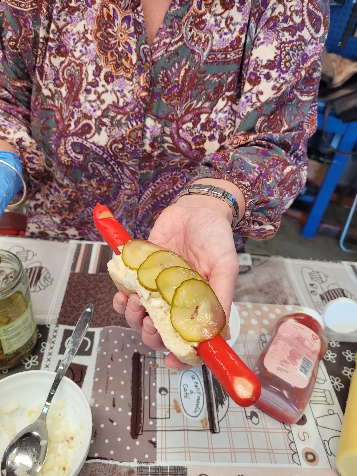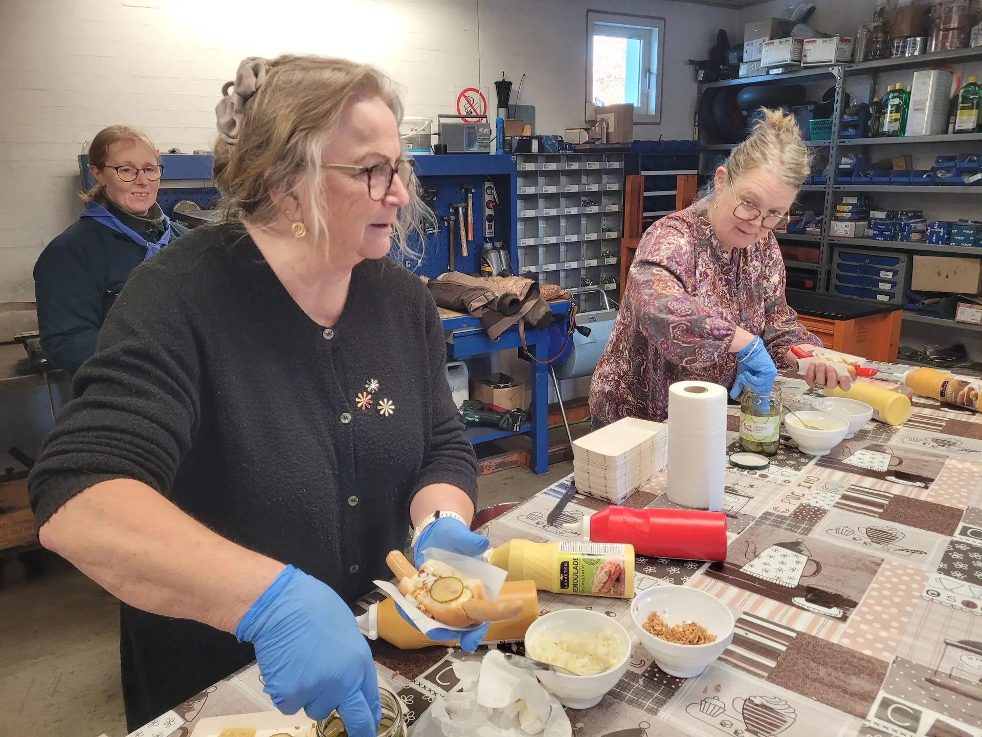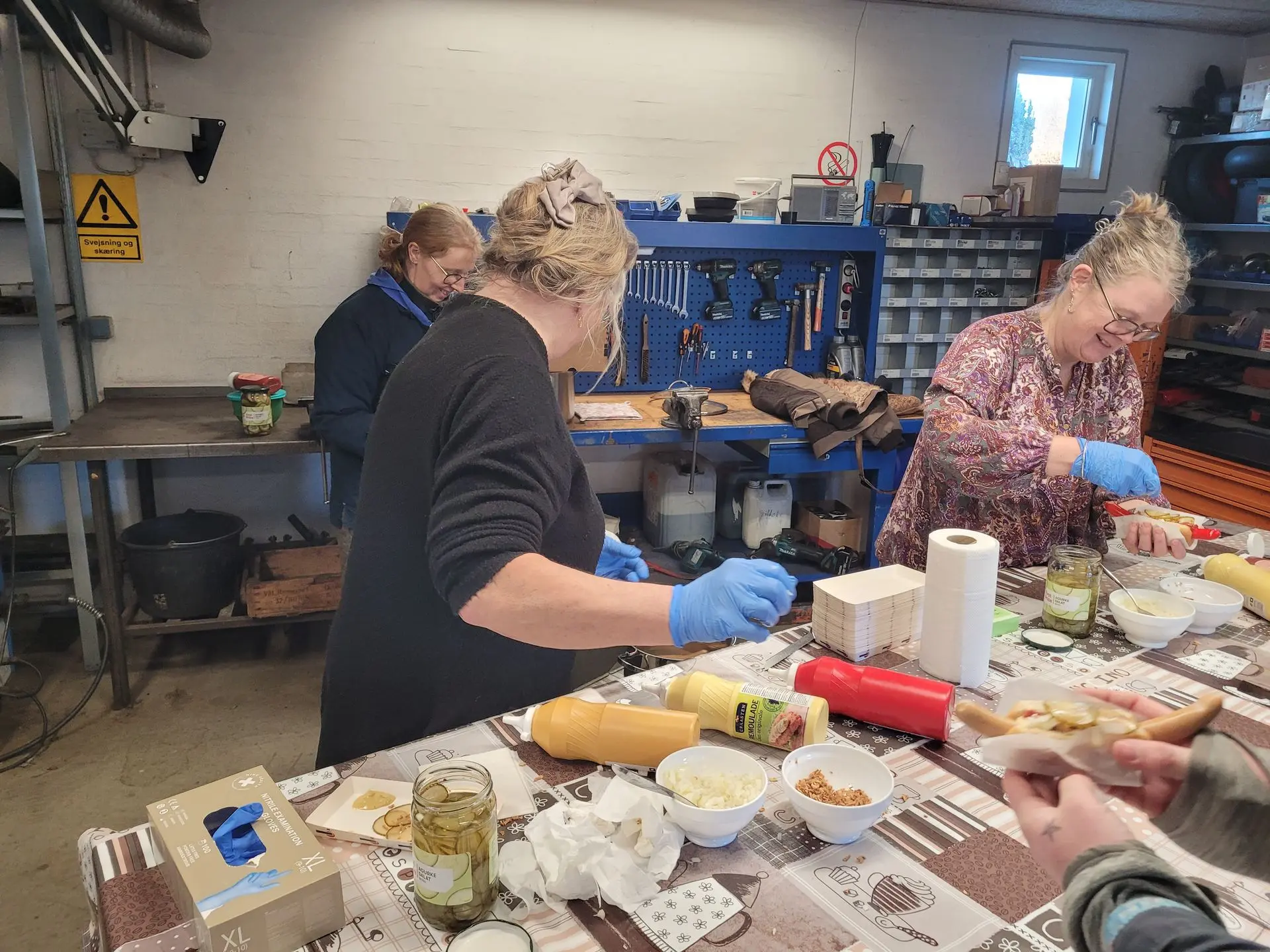 Og hotdogs var der. Gitte Lyse Gjesing, Ulla Wyrzykowski og Tina Munk havde forberedt en hotdogbod i maskinhuset. Køen var lang. Men de tre pølsedamer var hurtige. Ulla fortæller: