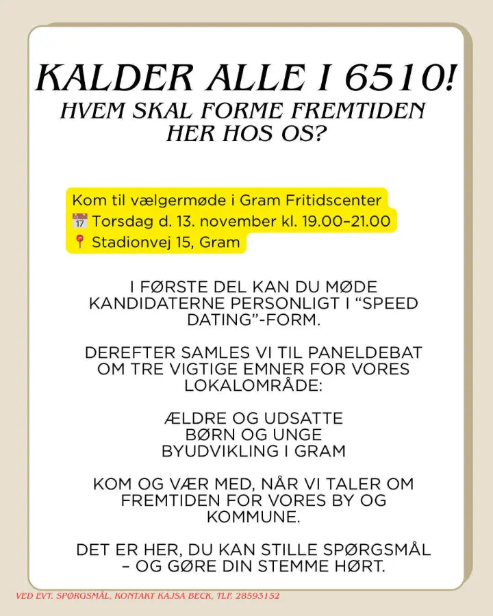 Jeg afholder vælgermødet, fordi jeg fra flere sider kunne mærke, at der var et ønske om det – og fordi jeg selv gerne vil møde kandidater fra alle partier, der stiller op i Haderslev Kommune. Da jeg bemærkede, at der ikke var arrangeret noget i Gram, tænkte jeg: “Så må jeg se, om jeg selv kan sætte gang i noget.” Derfor kontaktede jeg Gram Fritidscenter, som heldigvis bakkede op og ville lægge lokaler til vælgermødet! Derefter gik det stærkt, og jeg mærker heldigvis stor opbakning – både fra lokale og fra kandidaterne.