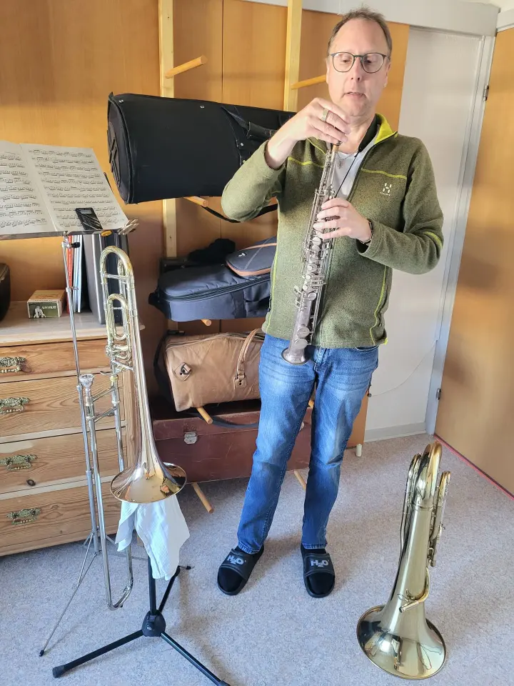 Jeg spiller mest på trombone, men også althorn, bariton, euphonium og alt muligt andet, smiler Kent. Jeg skriver også selv musik til de forskellige instrumenter – det er en stor fornøjelse for mig. Gamle instrumenter er spændende for mig, og jeg har fået en del restaureret.