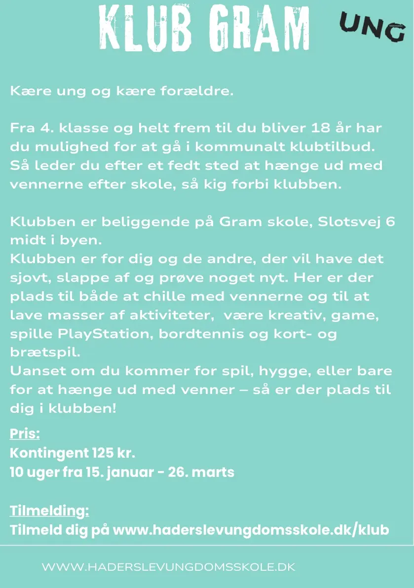 Torsdag den 15. januar 2026 kl. 13-15 åbner Klub Gram – en kommunal junior- og ungdomsklub på Slotsvej 6 . den gamle pedelbygning.