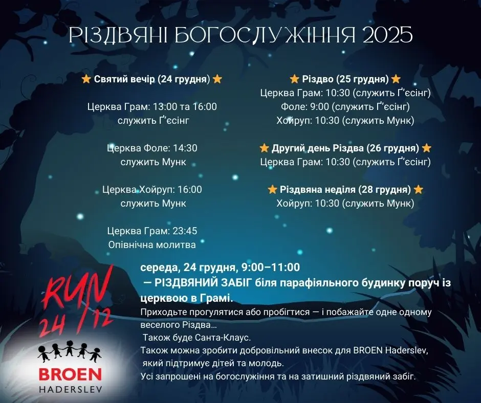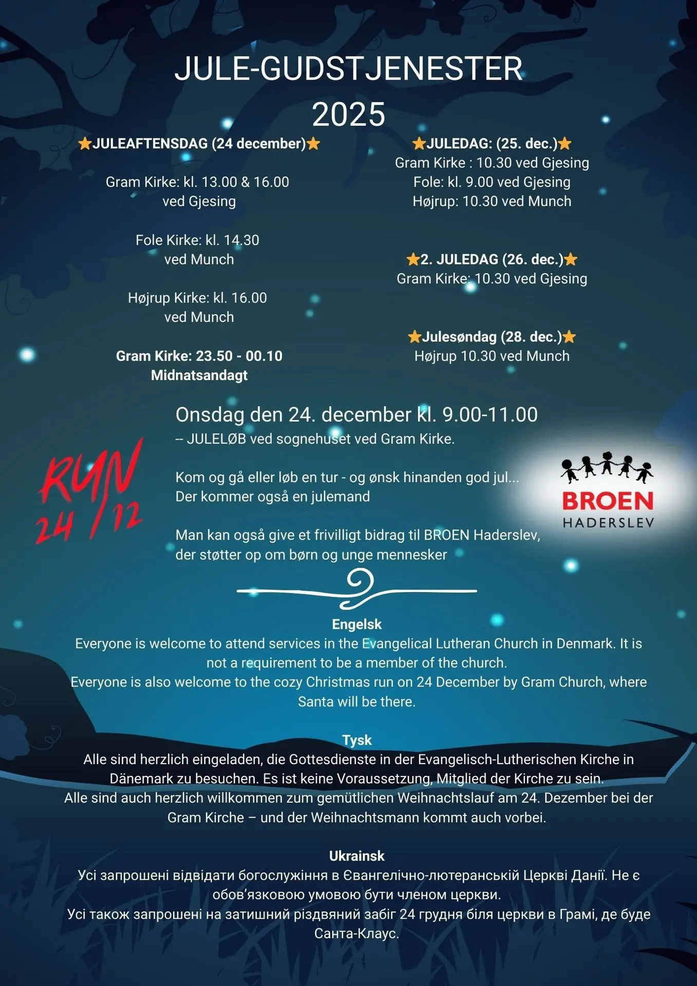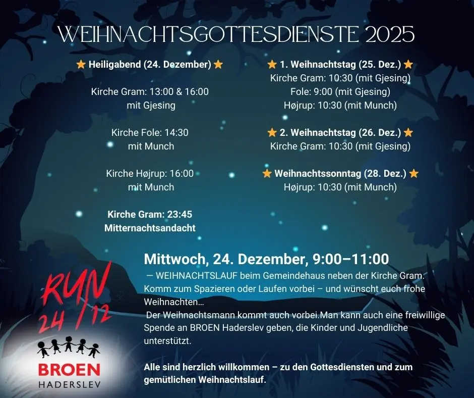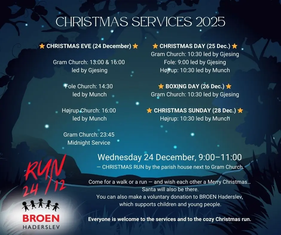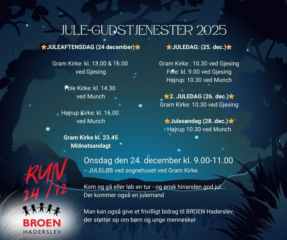 ”Vi samarbejder med BROEN Haderslev, der støtter op om udsatte børn og unge, så de kan gå til fodbold og spejder – sunde fællesskaber. Det betyder alt. Mellem 9 og 11 kan man komme til Gram Sognehus og løbe en tur. Ja, man må også gå. Der er også en julemand. Og hvis man har lyst, så kan man give en gave til BROEN Haderslev – men det er helt frivilligt.”
