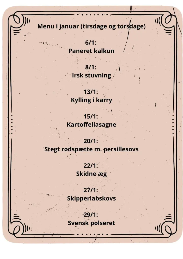 Maden skal bestilles på telefon 29 68 99 19 senest dagen før kl. 12.00.