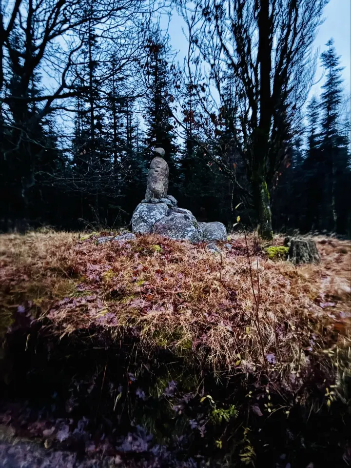 Mørket indhenter os pludseligt - men vi lader os ikke forstyrre af det - ingen af os er bange i mørket - skoven samler sig blot beskyttende og roligt om os - stilheden og støvregnen giver os et målfast trav - vi fornemmer stien og passerer "Stenmanden" - vogteren af - måske en dysse - måske et sagn - men han står dér - i mørket - viser os vejen - videre ned over skydebanens knoldede forhindringer - heldigvis uden snublerier eller spredehagl i bagdelen.....